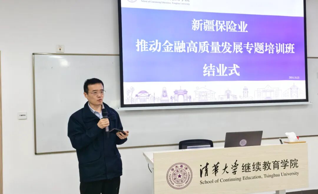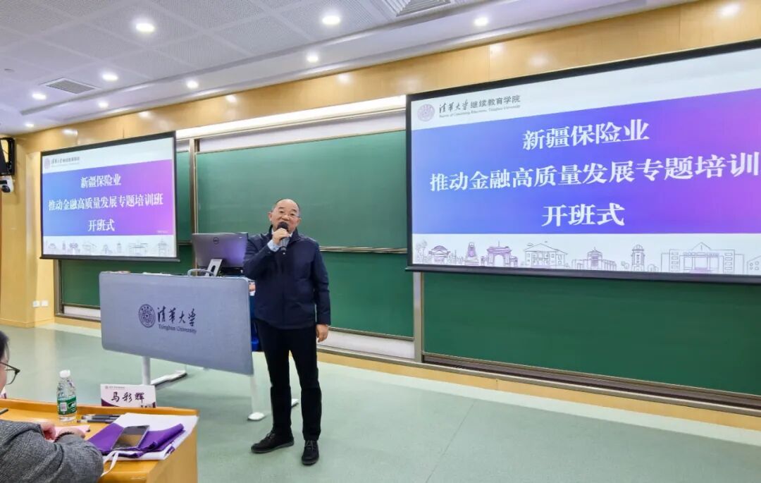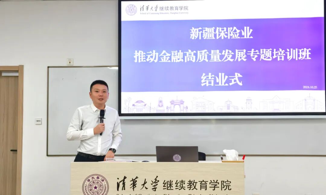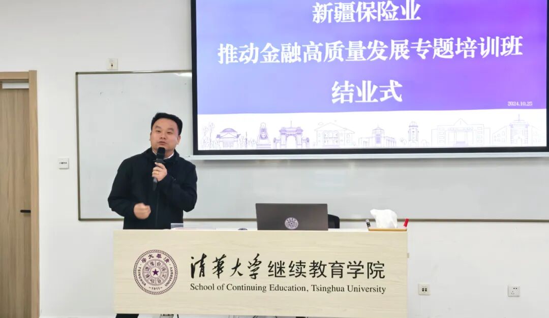 新疆保险学会会长、中华财险副总裁、新疆分公司党委书记、总经理余杰代表新疆保险学会向清华大学承接本次培训班及提供的资源和老师们的辛勤付出表示感谢。他表示,在当前全球经济下行的压力挑战下,保险业作为金融体系的重要组成部分,在服务实体经济、防范金融风险、深化金融改革等方面发挥着不可替代的作用,本次来到清华大学开展行业高管教育培训具有重要意义,培训师资规格之高、课程内容之优都前所未有,希望同学们珍惜此次难得的机会,全身心投入学习,深入思考、积极交流,为新疆保险业的高质量发展贡献更多的智慧和力量。
